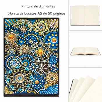 • Detalles: Cuaderno con portada de mandala en tonos azules y dorados, pensado para completar con diamantes y lograr un brillo sofisticado
