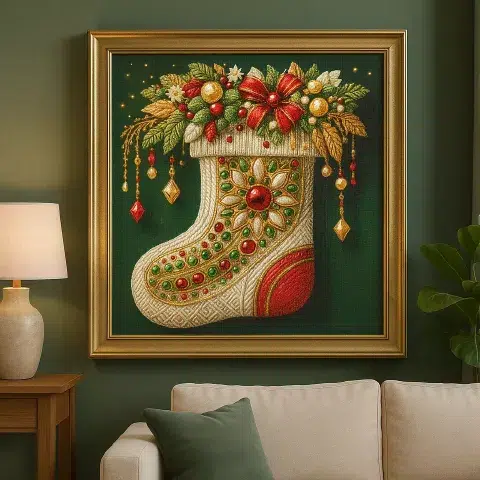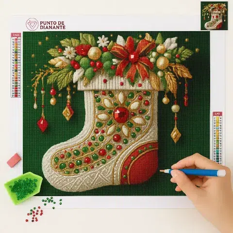 En Punto De Diamante cada cuadro es una invitación a disfrutar del arte con un toque festivo, el Cuadro Bota Navideña Bordada Punto de Diamante representa el espíritu de la Navidad con una composición cálida y llena de color.