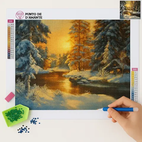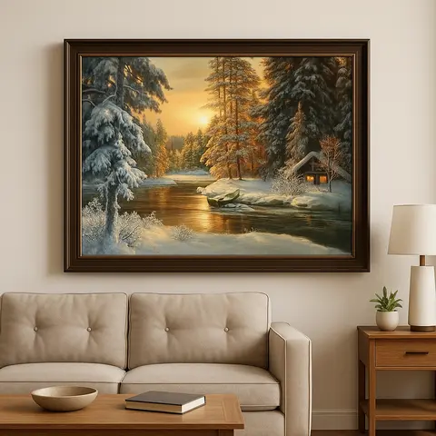 El Cuadro Cabaña Iluminada Dorada Bordado de Luz es una obra cálida y acogedora que captura la magia del invierno con su resplandor dorado y su ambiente sereno.
