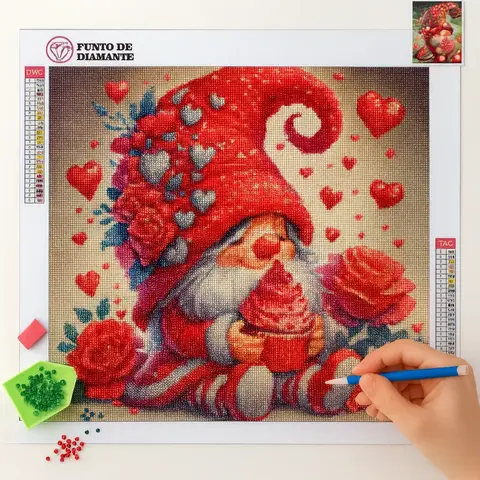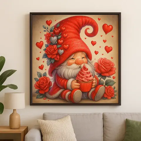 En Punto De Diamante cada cuadro es una historia llena de ternura y color, el Cuadro Duende amor cupcake Arte con Diamantes combina dulzura y creatividad en una escena encantadora que enamora a primera vista.
