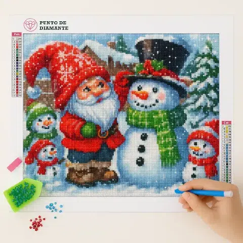 En Punto De Diamante cada creación cuenta una historia llena de ternura y color, el Cuadro Duende y Muñeco de Nieve Bordado de Luz reúne la magia de la Navidad en una escena brillante que transmite calidez y alegría.