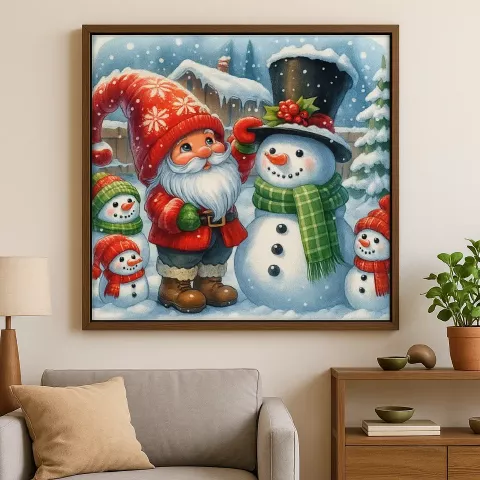 Detalles: Lienzo ilustrado con un duende navideño y un muñeco de nieve decorado con luces