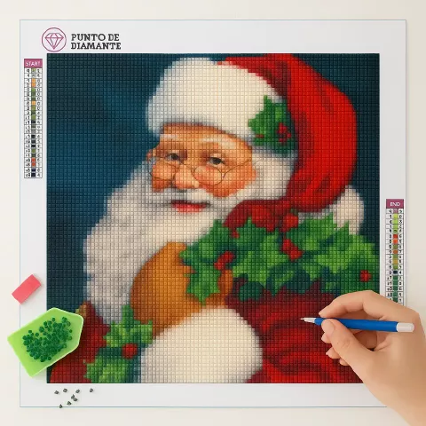Este diseño es ideal para quienes disfrutan de las manualidades durante la temporada más mágica del año, cada diamante que colocas ilumina el rostro amable de Papá Noel y los detalles brillantes de su corona.