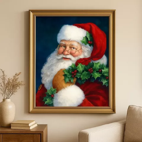 Detalles: Lienzo ilustrado con Papá Noel sosteniendo una corona decorativa festiva