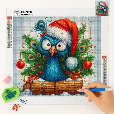 En Punto De Diamante cada cuadro cuenta una historia especial, el Pavo Real Azul Gorro Navidad Punto de Diamante combina elegancia, brillo y un toque festivo en una composición única que cautiva a primera vista.