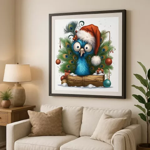 Detalles: Lienzo ilustrado con un pavo real azul luciendo un gorro de Navidad rodeado de destellos brillantes
